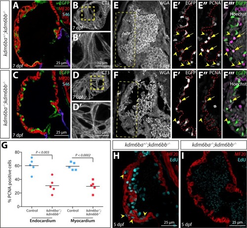 Kdm6b proteins enable coordinated endocardial and myocardial proliferation associated with early stage ventricle maturation. (A-C) Confocal immunofluorescence images of sagittal heart sections from 5 dpf kdm6b- and kdm6a/kdm6b-deficient Tg(kdrl:EGFP) larvae stained with anti-GFP (green, endocardium), anti-myosin heavy chain (MF20, red, myocardium), and anti-S46 (magenta, atrial muscle) antibodies. (B, D) Cardiac troponin (CT3) antibody staining of superficial sections through the heart of 5 dpf kdm6bb-/- and kdm6ba-/-; kdm6bb-/- larvae. B’ and D’ are zoomed images of the dashed yellow box regions. (E-F) Confocal imaged sagittal sections of 5 dpf control and combined kdm6b-deficient Tg(kdrl:EGFP) embryos stained with wheat germ agglutinin (WGA, grey) as well as anti-GFP (green in overlay panels, endocardium) and anti-PCNA (magenta in overlay panels) antibodies. Yellow boxes in E and F indicate zoomed regions shown in E’-F’’’. Arrows and arrowheads mark PCNA-positive endocardial and myocardial cells, respectively. (G) Scatterplot graphs showing the number of PCNA positive endocardial and myocardial cells within the outer curvature ventricular wall scored from matched sagittal heart sections of 5 dpf control and kdm6ba-/-; kdm6bb-/- larvae. Each point represents a distinct fish. P-values are from two-tailed Student's t-tests. (H, I) Confocal heart images of sagittal sectioned 5 dpf control and kdm6a/kdm6b-deficient larvae stained for EdU incorporation (cyan, proliferating cells) and with anti-myosin heavy chain antibody (red, MF20, cardiomyocytes).