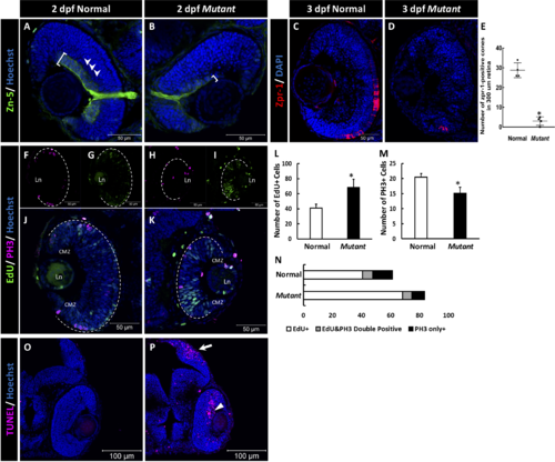 The retinal phenotype of the homozygous cct2-L394H-7del mutants at 2 pdf. (A, B) Staining of wild-type (A) and homozygous cct2-L394H-7del mutant (B) retinas with antibodies against Zn-5. Note a dramatic reduction of Zn-5 staining of the retinal ganglion cell layer (marked by a white bracket) and thinner optic nerve in cct2-L394H-7del mutant compared with wild-type. The lamination of the neural retina was more pronounced in wild-type embryos than in mutants. (C, D) The cone photoreceptor was underdeveloped in the homozygous cct2-L394H-7del mutants at 3 dpf. Staining of wild-type (C) and homozygous cct2-L394H-7del mutant (D) retinas with antibodies against zpr-1. (E) Quantification of zpr-1–positive cells in wild-type and homozygous cct2-L394H-7del mutant retinas (n = 4). (F–I) The distribution of PH3-positive and EdU-positive cells in the retina. In wild-type embryos, PH3-positive cells (F) and most of EdU-positive cells (G) were found in the ciliary marginal zone and the area of neuronal precursors localization. In the retina of homozygous cct2-L394H-7del mutants, PH3-positive cells were found in the ciliary marginal zone, area of neuronal precursors localization and lens epithelium (H). EdU-positive cells were found through the neural retina, in the ciliary marginal zone and lens epithelium (I). The white dashed lines indicate the eyecup boundaries. (J–K) Merged images of EdU and PH3 staining of the retina of wild-type (J) and homozygous cct2-L394H-7del mutant (K). (L–N) Quantification of EdU-positive, PH3-positive, and EdU/PH3-double positive cells in wild-type and homozygous cct2-L394H-7del mutant retinas (n = 10). (O, P) TUNEL staining of wild-type (O) and mutant (P) retinas. Arrow marks the optic tectum, the area of retinal ganglion cell axon projection; arrowhead marks TUNEL-positive cells in the neural retina. CMZ, ciliary marginal zone; Ln, lens. Scale bars: 50 μm. *P < 0.05.