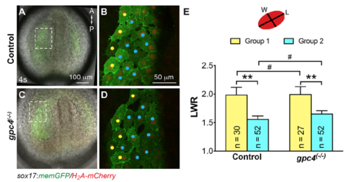 Morphology of anterior endodermal cells is not affected in gpc4 mutants. (A,C) Overlay of bright-field and epifluorescence images of Tg(sox17:memGFP/H2A-mcherry) embryos at 4s. Dashed boxes are regions in which cells were imaged for analysis of shape. (B, D) Confocal images of the endoderm at the region indicated in the dashed boxes in A, C. Endodermal cells at the lateral region and near the dorsal midline are labeled with yellow and cyan dots, respectively. A, anterior; P, posterior. (E) Schematic representation of the method used to measure cell shape (LWR, length-to-width ratio). Quantification of LWR of endodermal cells in seven control and six gpc4 mutant embryos. Bars represent the mean±s.e.m. The number of cells analyzed is indicated. #, p>0.05; **, P<0.01, student’s t-test. |