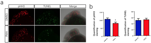 PKC hyper-activation has a mild effect on neurogenesis at 24hpf (a) pHH3 and TUNEL staining of zebrafish embryos. (b) Quantification of pHH3 and TUNEL staining within zebrafish head. (* p<0.05, t-test). |
