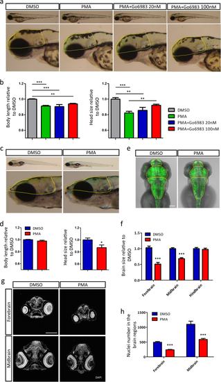 PKC overactivation during early development causes mild developmental delay and brain size deficit. a Lateral views of representative larvae (3 dpf) exposed to DMSO, PMA or PMA+Go6983. Head size was calculated with the boundary shown in yellow dotted line. b Quantitative representation of body length and head size (3 dpf) normalized to DMSO (DMSO n = 8, PMA n = 10, PMA+Go6983 20 nM n = 6, PMA+Go6983 100 nM n = 10, **p < 0.01, ***p < 0.001, one-way ANOVA). c Lateral views of representative larvae (9 dpf) previously exposed to DMSO or PMA. Head size was calculated with the boundary shown in yellow dotted line. d Quantitative representation of body length and head size (9 dpf) normalized to DMSO (DMSO n = 8, PMA n = 6, *p < 0.05, t-test analysis). e Dorsal views of zebrafish brains (3 dpf) visualized by Huc:GFP. Brain region was divided by yellow dotted line. Scale bar, 100 μm. f Quantitative representation of different brain regions normalized to DMSO (n = 16 per group, ***p < 0.001, t-test analysis). g DAPI staining of zebrafish head sections (3 dpf). Scale bar, 100 μm. h Nuclei number in forebrain and midbrain (n = 6 per group, ***p < 0.001, t-test) |