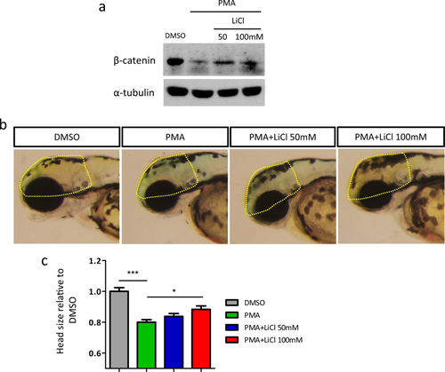 Stabilizing of β-catenin by gsk3β inhibition partially restores the head size deficit. a Western blot analysis of β-catenin. b Lateral views of representative larvae (3 dpf) exposed to DMSO, PMA or PMA+LiCl. Head size was calculated with the boundary shown in yellow dotted line. c Quantitative representation of body length and head size (3 dpf) normalized to DMSO (DMSO n = 14, PMA n = 18, PMA+LiCl 50 mM n = 12, PMA+LiCl 100 mM n = 18, *p < 0.05, ***p < 0.001, one-way ANOVA) |