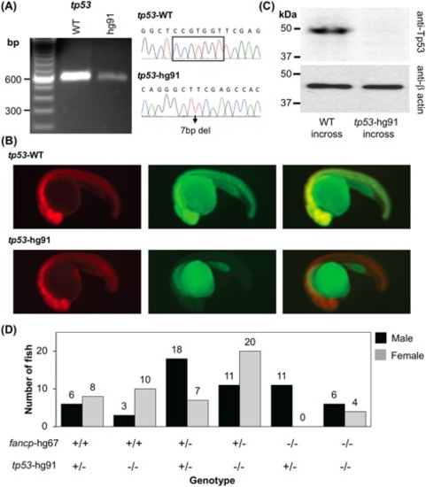 Co-mutation in tp53 gene rescues female-to-male sex reversal of fancp homozygous knockouts. (A) RT-PCR confirmed the absence of any aberrant splice variants around tp53 gene mutation. Sanger sequencing confirmed the presence of CRISPR-Cas9 introduced 7bp deletion mutation. The products were resolved on 2% agarose gel. (B) Reporter assay to check the expression of tp53 frameshift mutant. Representative images at 1 dpf of embryos co-injected with the specified reporter mRNA and TagRFP are shown as RFP (left panel), GFP (middle panel) and merged (right panel). (C) Western blot analysis shows absence of Tp53 protein in the knockout embryo extracts. Twenty-four hpf embryos collected from tp53hg91/hg91 homozygous knockout fish incross were used to check the loss of expression of Tp53 protein. Embryos obtained from TAB5 incross were used as WT controls. Expression of β-actin was used as loading control. (D) Progenies from fancphg67/+;tp53hg91/+ and fancphg67/+;tp53hg91/hg91 breeding were genotyped around 4 mpf and the sex was determined. Number of male and female fish in each genotype category is presented. The genotypes are marked on the X-axis. Among the fancp homozygous knockouts, only males were observed with fancphg67/hg67;tp53hg91/+ genotype, whereas both males and females were observed with fancphg67/hg67;tp53hg91/hg91 genotype.