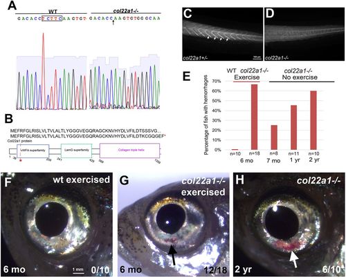 col22a1−/− mutant adults exhibit hemorrhages. (A,B) Generation of col22a1 zebrafish mutant line using TALEN. Sanger sequencing data of homozygous col22a1 mutant show that there is a 5 bp deletion TCTTC (boxed; arrow in the right panel) that results in a frame shift (A) and a premature stop codon in the protein sequence (B). (C,D) Immunostaining against zebrafish Col22a1 at 3 dpf in col22a1+/− and col22a1−/− embryos. Staining is absent at the myoseptae in the col22a1−/− mutant (arrows) compared with the col22a1+/− embryo, suggesting that the mutation is likely null. Selected sections from Z-stack were merged using the Extended Focus feature within the Axiovision software (Zeiss). (E) The frequency of hemorrhages increases with age in col22a1−/− mutants, while exercise caused col22a1−/− mutants to exhibit the phenotypes at an earlier age. (F,G) A 6-month-old col22a1−/− adult experiences visible blood accumulation in the eyes after a 3-week course of intermittent forced exercise (black arrow, G), whereas the WT adult does not (F). (H) Without exercise, a 2-year-old col22a1−/− adult also exhibits visible blood accumulation in the eyes (white arrow).
