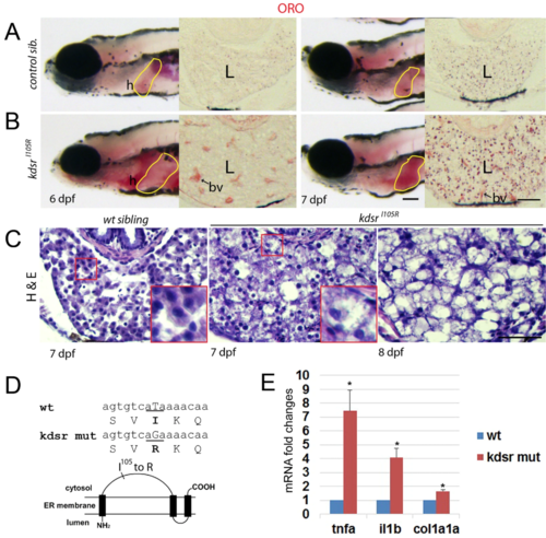 Progression of liver injury in the KdsrI105R zebrafish mutant. Whole mount oil-red O (ORO) staining in wild type control sibling (A, left) and kdsr mutant (B, left) at 6 days post fertilization (dpf) and 7 dpf. ORO staining performed in transverse section of the liver (L, right panels of A and B). N = 10 per each. Lipid accumulation in the heart (h) and blood vessel (bv) are marked in images of panel B. H & E staining results in control at 7 dpf (left), mutant at 7 dpf (middle), and mutant at 8 dpf (right) (C, n = 6 per each). The magnified area depicts hepatocyte ballooning in mutants at 7 dpf. Images shown are representative of at least 10 other zebrafish or livers, respectively. Scale bars = 100 µm (whole mount ORO staining in A and B), 40 µm (ORO staining on the liver section in A and B), and 100 µm (H&E staining in C). The predicted protein structure of kdsr and the locus of the mutated amino acid is shown in (D). Relative mRNA expression of tnfa, il1b, and col1a1a in the wild type and mutant siblings is shown in (E). *P ≤ 0.05. |