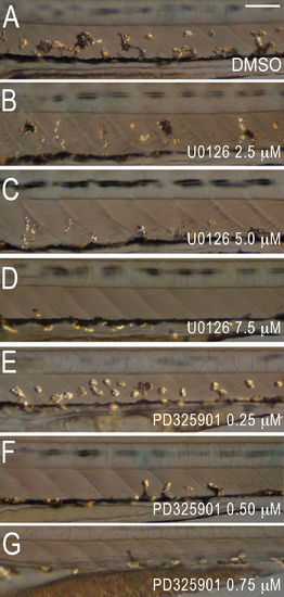 Inhibition of MEK rescues the pde phenotype.Treatment with increasing concentrations of the MEK inhibitors U0126 (2.5–7.6 μM) and PD 325901 (0.25–0.75μM), from 6–96 hpf, shows increasing rescue of the ectopic pigment cells. Scale bar = 100 μm (A-G). |