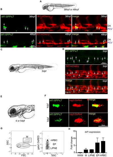 bif1 is also expressed during definitive and adult hematopoiesis. (A) Schematic indicating the approximate area in the trunk shown in the images in B (dotted rectangle). (B) Confocal images of the trunk region of double-positive bif1:GFP-LT and flk1:mcherry embryos at 36 hpf and 48 hpf. Arrows indicate double-positive cells. (C) Schematic indicating the approximate area in the tail shown in the images in D (rectangle). (D) Confocal images of the CHT of double-positive bif1:GFP-LT and flk1:mcherry embryos at 3 dpf. Arrows indicate double-positive cells. (E) Schematic representing the head of a zebrafish at 4 dpf. The position of the thymus is outlined by the dotted rectangle. (F) Confocal images of thymic area of double-positive bif1:GFP-LT;rag2:DsRed embryos at 4 and 5 dpf. (G) Results from FACS-sorted cells of WKM dissected from 1-year-old embryos. n=3. (H) Expression of bif1 by qPCR on FACS-sorted cells, relative to the WKM. Data were obtained from biological triplicates. SSC, side scatter; FSC, forward scatter; M, myeloid; L/PNE, lymphocytes and progenitors non-erythroid; EP, erythroid progenitors; mRBC, mature red blood cells; WKM, whole kidney marrow. |