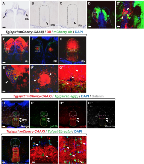 SPX1 and GALR2a/2b expression in the habenula and interpeduncular nucleus. Transverse sections of the adult zebrafish brain, dorsal to the top. (A–C) In situ RNA hybridization in the adult brain with spx1 (A), galr2a (B), and galr2b (C) RNA. (A) Arrows indicate the expression of spx1 mRNA in the habenula. Black arrowheads indicate galr2a and galr2b mRNA expression, respectively, in the IPN (B,C). (D,D’) Transverse sections of the habenula (D) of Tg(spx1:mCherry-CAAX); Tg(pou4f1-hsp70l:gfp) zebrafish. (D) White, green, and blue dotted lines mark lateral and medial subdivisions of the dorsal habenula and ventral habenula, respectively. (D’) is a high magnification image of the box area in (D). White arrowheads indicate pou4fl+ spx1:mCherry-expressing cell body in the dHbM. (E–G’) Transverse section of the Hb (E,E’), FR (F,F’), and IPN (G,G’) of DiI-labelled Tg(spx1:mCherry-CAAX) zebrafish. Panel E’–G’ are high magnification images of white boxes in panel E–G. Yellow dotted lines mark DiI-labelled Hb (E), FR (F), and IPN (G). White arrowheads indicate that co-localization of DiI and mCherry fluorescence. (H–I”) Transverse sections of Tg(spx1:mCherry-CAAX); Tg(galr2b:egfp) zebrafish, which were labelled with DAPI. White, magenta, and yellow dotted lines mark the dorsal, intermediate, and ventral IPN, respectively. (H–H”’) Section views labelled with anti-galanin antibody. White arrowheads indicate the intermediate and ventral IPN, where spx1:mCherry+ axonal projections were observed. (I–I”) Panel I’ and I” are high magnification images of white and yellow boxes of panel I, respectively. White arrowheads indicate close contacts between EGFP+ cells and mCherry+ nerve fibres. Abbreviation: FR, fasciculus retroflexus; Hb, habenula; IPN, interpeduncular nucleus; Scale bar: 50 μm in A–I. 10 μm in D’–I”. |
