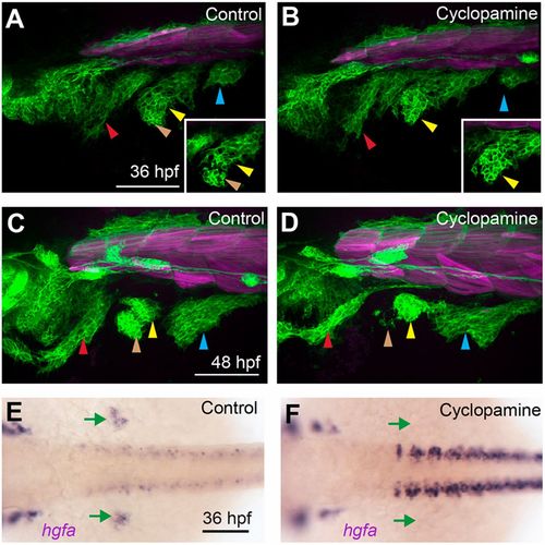 Smo function is required during migration for AbFM/AdFM partitioning. (A-D) Confocal projections of six1b:lyn-GFP (green) and mylpfa:mCherry (magenta) transgene expression in embryos fixed at 36 hpf (A,B) or 48 hpf (C,D). When embryos are treated with cyclopamine beginning at 24 hpf, fin buds form and become populated with MMPs; however, few MMPs contribute to the AbFM. At 36 hpf (A,B), we show an individual confocal plane (inset) that highlights defective AbFM/AdFM partitioning. (E,F) Embryos treated with cyclopamine from 24-36 hpf conspicuously lack hgfa expression in the fin bud domain (green arrows). Arrowheads are as described in Fig. 1 legend. Scale bars: 100 µm.