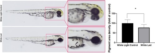 Effects of White LED light pigmentation in zebrafish embryos. (A) Synchronized embryos (n = 20) were exposed to White LED light and White light control. The effects on zebrafish pigmentation were observed under a stereomicroscope at 3 dpf. The pigmentation area density in the treated embryos was normalized to that of the control embryos using the ImageJ software. *p < 0.05, compared to the control. |