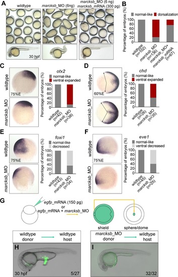 Marcksb is required for specification of ventral cell fate.(A) Knockdown of marcksb showed dorsalization defects, which could be rescued by overexpression of morpholino insensitive mRNA of marcksb. Up panels, field view of embryos at early-somite stage; lower panels, representative embryos at 24 hours post fertilization (hpf). (B) The percentage of embryos with normal-like or dorsalization defects. “n” represents the number of embryos we observed. (C-F) Whole-mount in situ hybridization (WISH) showed the expansion of dorsal markers otx2 (neural ectoderm) (C) and chordin (dorsal margin) (D) expression, and the shrinkage of ventral markers foxi1 (non-neural ectoderm) (E) and eve1 (ventral margin) (F) expression in marcksb morphants. The percentage of embryos with indicated phenotype were shown aside their representative images. For otx2, foxi1 and eve1, embryos are lateral view with animal-pole to the top and dorsal to the right; for chd, embryos are animal-pole view with dorsal to the right; arrows in chd panels indicate the expansion locations of signals. (G) A schematic showing the procedure of the tail organizer transplantation assay. (H) A representative wildtype-to-wildtype transplantation embryo showing an induction of ectopic tail by grafting the tail organizer region of the wildtype embryo. (I) A representative morphant-to-wildtype transplantation embryo without induction of ectopic tissue by grafting the tail organizer region of the marcksb morphant embryo. The ratio at the right corner indicates the number of embryos with the representative phenotype/the total number of observed embryos.