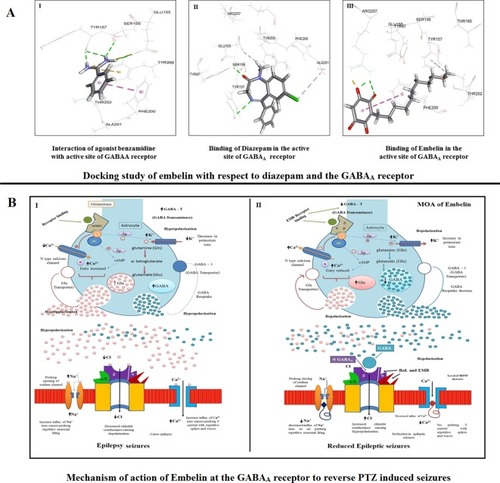 (A) Docking study of embelin with respect to diazepam and the GABAA receptor. (B) Proposed mechanism of action of embelin at the GABAA receptor to reverse PTZ induced seizures. 8B1—During a seizure, a prolonged opening of the voltage-gated Na+ channel causes an influx of sodium ions which leads to depolarization and repetitive neuronal firing. The opening of Ca2+ channels increases the influx of positive calcium ions causing prolonged spikes and T current waves. As there is no affinity for the GABAA receptor, the decreased Cl− influx causes epileptic excitation inside the neuron cell. 8B2—EMB shows higher affinity for GABAA receptor binding; it facilitates GABA mediated Cl− channel opening with cell hyperpolarization and reduced seizure frequency, prolonged inactivation of the voltage-gated neuronal Na+ channel, prevented intracellular Na+ accumulation, reduced Ca2+ influx, and inhibited glutamate.