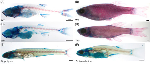 Cleared and stained zebrafish and Danionella. A, Wild‐type (WT) juvenile zebrafish. B, WT adult zebrafish. C, Hypothyroid (TH−) juvenile zebrafish. D, TH− adult zebrafish. E, Adult Danionella priapus. F, Adult Danionella translucida |
