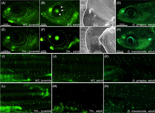 The lateral line system in zebrafish and Danionella. A and B, DiASP live staining of head neuromasts in WT juvenile (13 mm SL) and adult (18+ mm SL). Arrowhead indicates rod‐shaped canal neuromasts at adult stage. C, Scanning electron micrographs of a supraorbital canal neuromast in WT adult. Dotted line outlines the neuromast; solid line outlines the bony edge of the canal. D, Head neuromasts in Danionella priapus adult. E‐G, Same as B‐D in TH− zebrafish. H, Facial neuromasts in Danionella translucida adult. I‐N, DiASP live staining of trunk neuromasts in WT juvenile zebrafish (13 mm SL, I), WT adult (18+ mm SL, J), D. priapus adult (K), TH− juvenile (13 mm SL, L) TH− adult (18+ mm SL, M), and D. translucida adult (N). SL, standard length; TH−, hypothyroid; WT, Wild‐type |