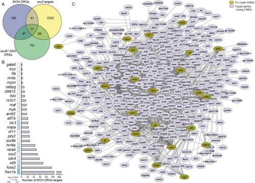 Ethanol induced gene expression changes during zygotic genome activation. (A) Venn diagram shows overlapping of ethanol dysregulated genes identified in the Affymetrix GeneChip microarray analysis of control and ethanol treated embryos at 4.5 hpf with potential Sox2 targets and the genes differentially expressed in quadruple knockdown of SoxB1 factors, which includes Sox2 (Soxb1 QKD targets). (B) Twenty five of the ethanol-dysregulated transcription factors showing the enrichment of their targets in our ethanol-dysregulated gene set. (C) Transcription factor-target gene network visualizing using cytoscape shows interactions among the transcription factors (gold circles) and their target gene (blue circles) in our dataset. Ethanol dysregulated targets of Sox2 are co-shared by other dysregulated transcription factors.