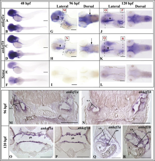 ankef1a and ankef1b expression in 48, 96, and 120 hpf embryos. A,C,E are lateral views, while B,D, and F are dorsal views. Black arrowheads in G-H and J-K indicate pharyngeal staining. Staining in the swim bladder region in 96 and 120 hpf is denoted by white arrowheads in G-H and J-K. Arrows in G-H point to otic vesicles. Scale bars for each whole mount images A-L = 200 μm. Relative whole-mount positions corresponding to cryosections M-N are indicated by dashed line and adjacent boxed red letters in G-H and J-K. M-N demonstrate ankef1a and ankef1b expression in the otic vesicles of a 96 hpf embryos. O–P show ankef1a and ankef1b expression in the pharynx of 120 hpf embryos. Q-R indicate ankef1a and ankef1b expression in the swim bladder of 120 hpf embryos. g: gut; o.v.: otic vesicle; pa: pancreas; ph: pharynx; s.b.: swim bladder; y: yolk. Scale bars for cryosections M-R = 100 μm. |