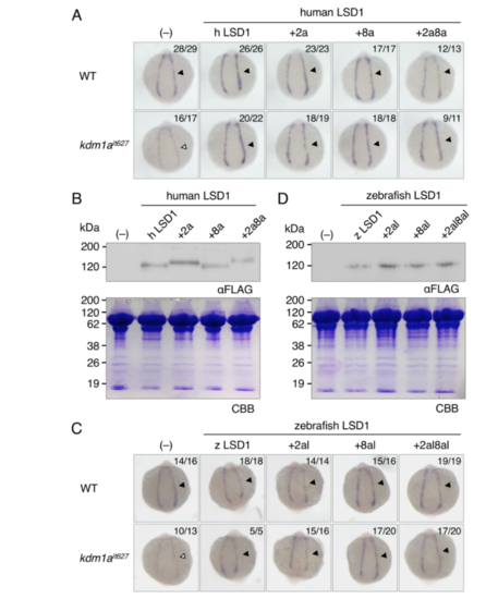 Phenotypic rescue experiments using human and zebrafish LSD1 variants. (A) The gata1a expression at 15 hpf in the lateral plate mesoderm (arrowheads) of wild-type or kdm1ait627 embryos injected with or without mRNAs encoding indicated human LSD1 variants was detected by WISH analysis. +2a, LSD1+2a; +8a, LSD1+8a; +2a8a, LSD1+2a8a. The numbers in each picture indicate the numbers of embryos with similar staining profiles and tested embryos. WISH was performed in at least two separated trials. (B) Immunoblot analysis using anti-FLAG antibody of FLAG-tagged LSD1 variants in 15-hpf wild-type embryos injected with or without mRNAs encoding indicated human LSD1 variants. Total protein loading was shown by CBB staining. (C) The gata1a expression at 15 hpf in the lateral plate mesoderm (arrowheads) of wild-type or kdm1ait627 embryos injected with or without mRNAs encoding indicated zebrafish LSD1 variants. +2al, LSD1+2al; +8al, LSD1+8al; +2a8al, LSD1+2a8a. (D) Immunoblot analysis using anti-FLAG antibody of FLAG-tagged LSD1 variants in 15-hpf wild-type embryos.