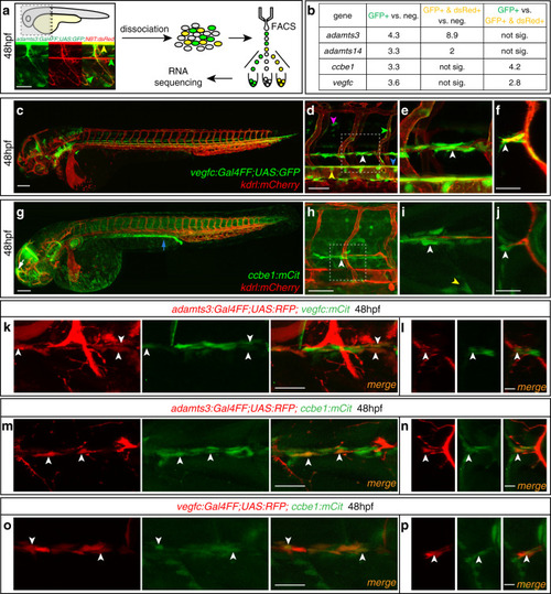 Non-neuronal adamts3-expressing cells co-express vegfc and ccbe1.a Strategy for transcript analysis of adamts3-expressing cell populations by RNA sequencing. adamts3:Gal4FF;UAS:GFP; NBT:dsRed-positive trunks were dissociated at 48 hpf and cells were FAC-sorted into (1) adamts3-expressing neurons (GFP + /dsRed+, yellow arrowhead), (2) adamts3 + non-neuronal cells (GFP+, green arrowheads) and (3) a negative control. Pooled cell populations were analyzed by RNA sequencing. b Summary of RNA sequencing analysis. Values reflect fold-changes in transcript abundance for indicated genes upon comparison of cell populations stated in the column headings. To identify significant gene expression differences, p values were determined by Wald test and an FDR < 0.05 and FDR-adjusted p value < 0.1 cutoff was used (source data are provided as a Source Data file). c Lateral view of a vegfc:Gal4FF; UAS:GFP; kdrl:mCherry transgenic embryo at 48 hpf. d Higher magnification showing vegfc expression in HM cells (white arrowhead), in the hypochord (blue arrowhead), the DA (yellow arrowhead), in arteries (green arrowhead) and in neurons (magenta arrowhead). e Zoom-in of the boxed region in (d) highlighting vegfc-expressing cells at the HM (arrowhead). f Virtual cross section focusing on the HM, showing juxtaposition between a PL and vegfc-expressing cells (arrowhead). g Lateral view of a ccbe1:mCitrine; kdrl:mCherry transgenic embryo at 48 hpf showing ccbe1 expression in the pronephros (blue arrow) and epiphysis (white arrow). h Higher magnification demonstrating ccbe1 expression at the HM (arrowhead). i Partial projection of the marked region in (h) showing ccbe1-expressing cells at the HM (white arrowhead) and the segment boundary (yellow arrowhead). j Virtual cross section indicating ccbe1+ cells at the HM (arrowhead). k, m, o Lateral views (partial z-projections) and l, n, p virtual cross sections of the HM region at 48 hpf. Arrowheads indicate cells with co-expression of the indicated transgenes. k, ladamts3 and vegfc are co-expressed by individual cells at the HM. m, n Mesenchymal cells at the HM co-express adamts3 and ccbe1. o, p Overlapping expression of vegfc and ccbe1 in HM cells. Scale bars in a, d, h: 50 µm; c, g: 100 µm; f, j, k, m, o 25 µm; l, n, p: 10 µm. DA dorsal aorta, HM horizontal myoseptum, hpf hours post fertilization, neg. negative cell population, sig. significant.