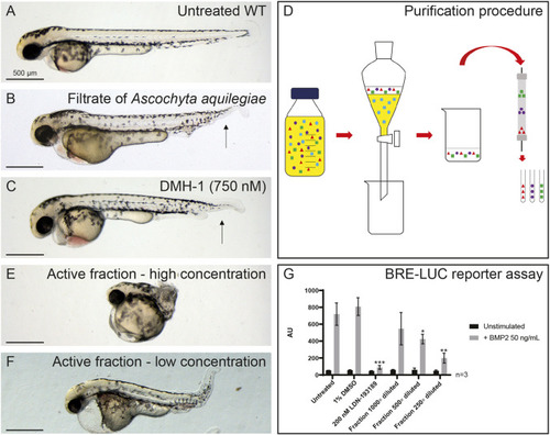 Identification of a fungal filtrate with activity consistentwith inhibition of BMP signaling. (A) Untreated control, not treated with fungal filtrate. WT, wild type. (B) An example of a phenotype induced by the filtrate of A. aquilegiae mixed in 1:1 ratio with E3 medium, with treatment at 6-48 hpf. (C) Phenotype induced by 750 nM DMH-1. The arrows in B and C indicate loss of the ventral fin. (D) Schematic overview of purification of active component. The filtrate is extracted with 3×1/3 volume ethyl acetate. The ethyl acetate fractions are than combined and dried. The residue is dissolved in DMSO and subsequently loaded onto a preparative HPLC column. Fractions are collected every 63 s. (E,F) Phenotypes induced by purified fraction, at high (E) and low (F) concentrations. In A-C,E,F, ten embryos were incubated per condition; representative pictures are shown. (G) Dose-dependent inhibitory effects of purified fraction of fungal filtrate on BMP2-induced Smad1/5-dependent BRE-luc transcriptional reporter activity. Lack of significant effect of vehicle control DMSO and potent antagonizing effect of BMPR type I kinase inhibitor LDN-193189 are shown. Results are expressed as mean±s.d., *P<0.05, **P<0.01, ***P<0.001 (Student’s t-test, two-tailed, unpaired).