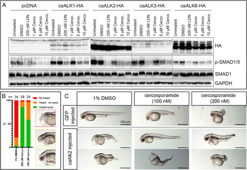 Cercosporamide selectively inhibits caBMPR type I in cultured mammalian cells and zebrafish embryos. (A) HEK 293T cells were transfected with empty vector (pcDNA) or expression vectors for caALK1, caALK2, caALK3 or caALK6 each with a haemagglutinin (HA) epitope tag at the carboxy terminus. The cells were treated with vehicle (1% DMSO), LDN193189 (200 nM) or a range of cercosporamide concentrations (1-10 µM as indicated). Subsequently, the cells were lysed and the lysates run on SDS-PAGE gels. The material on the gel was transferred to blots and parallel blots were probed with antibodies specific for HA (epitope tag on receptors), phosphoSMAD1/5/8 (p-SMAD1), SMAD1 or GAPDH (loading control). Dashed lines indicate the borders of different gels. (B) Cercosporamide partially rescued caAlk2-induced developmental defects in zebrafish embryos in vivo. Bar chart shows the phenotype distribution of embryos injected with caAlk2 mRNA and subsequently treated with 1% DMSO, 100 nM or 200 nM cercosporamide from 2 hpf onwards. The severity of the phenotype (examples depicted in the insets) is plotted as red (severe; no head), orange (intermediate; head structures present, no eyes) and green (mild; head structure with eyes detectable). The total number of embryos (n) is indicated. (C) The phenotypes of the rescued embryos are highly variable; therefore, we depicted two representative individuals of ten embryos that were treated for each condition.