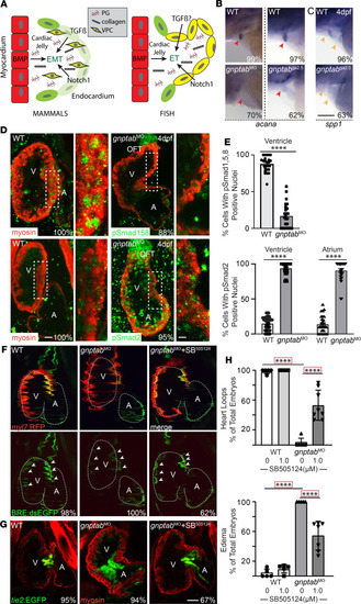 Disruptions in BMP and TGF-β signaling are associated with MLII heart and valve defects.(A) Schematic illustrates role for TGF-β, BMP, and Notch signals during AV valve development comparing mammals and fish. PG, proteoglycan; VPC, valve precursor cell; EMT, endocardial to mesenchymal transition. (B and C) In situ analyses of aggrecan (acana, red arrowheads) (B) and osteopontin (spp1, yellow arrowheads) (C) in 4 dpf embryos show defects in expression of the cardiac jelly are associated with loss of mesenchymal migration in gnptab/MLII morphants and mutants. Percent values indicate the number of embryos with the pictured phenotype. n = 50–65 embryos from 3 experiments. Scale bar: 50 μm. (D) Confocal images of WT and gnptab morphants stained immunohistochemically for myosin (red) and either pSmad1/5/8 or pSmad2 (green) illustrate reduced BMP and increased TGF-β signaling in MLII hearts. Boxed areas highlight region particularly affected, which are magnified in panels to the right. V, ventricle; A, atrium; OFT, outflow tract. n = 25 embryos from 3 independent matings. Scale bar: 20 μm. (E) Graphs show the percentage of cells in the ventricle and atrium with nuclear localized pSmad2 and pSmad1/5/8 staining. Data are presented as mean ± SEM. ****P < 0.0001 using 2-tailed Student’s t test. (F) Live confocal images of 4 dpf embryos expressing the BRE:dsEGFP (reports BMP signaling, denoted by white arrowheads) and myl7:RFP (labels cardiomyocytes red) confirm reduced BMP signaling (labeled green by BRE:dsEGPP) in the ventricle of MLII hearts, which is restored when TGF-β signaling is inhibited with SB505124. n = 10–12 embryos from 3 independent experiments. (G) Confocal images of tie2:EGFP+ (green) WT, gnptab-deficient morphants, and TGF-β–inhibited gnptab-deficient morphants treated with SB505124. Embryos stained immunohistochemically for myosin (red). n = 25–30 embryos from 3 independent experiments. Scale bar: 30 μm. (H) Graphs show percent of embryos whose hearts loop normally and that exhibit edema. For simplicity, each dot represents the average value obtained from an experiment containing 25–30 embryos. Total n > 100 embryo per condition. Data represent mean ± SEM. ****P < 0.0001 using Dunnett’s test with correction.