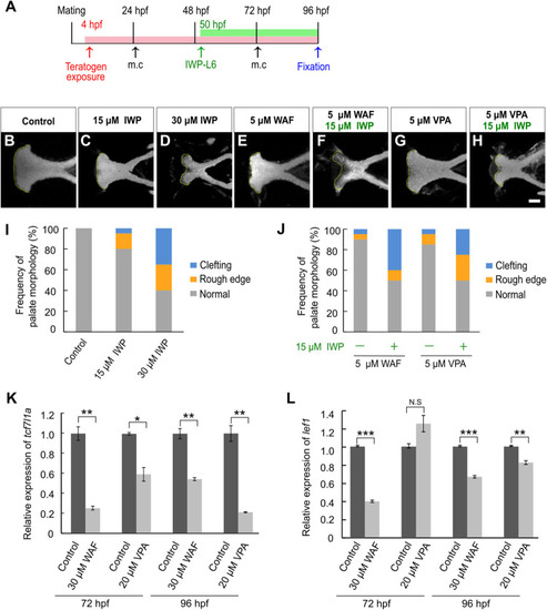Chemical-induced cleft palate was induced by inhibition of the canonical Wnt signaling pathway. (A) Experimental time-course. m.c.: medium change. (B–H) Fluorescence images of the palate at 96 hpf. Nuclei of cartilage cells were stained with DAPI. Yellow dotted line indicates the anterior edge of the palate. (I,J) Frequency of palate morphology. n = 20 for each sample. (K,L) Quantification of relative levels of tcf7l1a(K) and lef1(L) mRNA isolated from the neurocranium at 72 and 96 hpf. Each mRNA level was normalized by gapdh mRNA by the comparative CT (2– ΔΔCT) method. Data are shown as mean ± SD from triplicate experiments. *P < 0.05, **P < 0.01, ***P < 0.001 (two-tailed Welch’s t-tests). Scale bar: 50 μm.