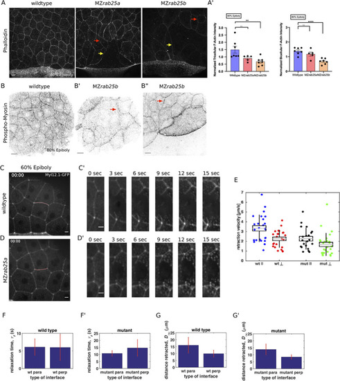 (A) Lateral views with animal pole to the top of z-confocal projections of phalloidin stained WT, MZrab25a and MZrab25b embryos stage-matched at 80% epiboly; red arrows show reduced cortical actin in normal sized cells; yellow arrows show reduced actin in large cells; Scale bar 20 μm. (A’) Quantification of normalized tricellular and bicellular F-actin intensity at 80% epiboly. WT (n = 90,N = 9), MZrab25a (n = 90,N = 9) and MZrab25b (n = 90,N = 9). Means: SEM; Mann-Whitney, **,p<0.001. (B) Confocal z-confocal projections of WT and MZrab25b embryos at 80% epiboly antibody stained for pMyosin. Red arrows denote uneven distribution of pMyosin along individual MZrab25b cellular junctions. Scale bar 20 μm. (C–D’) Confocal z-confocal projections of WT or MZrab25a Tg(Myl1.1-Gfp) at 60% epiboly; lateral positioned embryo focused on EVL margin; red line marks the ablated junction. Scale bar 5 μm. (E–G’) Initial recoil velocity, relaxation time and distance retracted in WT and MZrab25a embryos following junction laser cutting (see Materials and methods). WT and MZrab25a perpendicular and parallel cuts (n = 26,23);(n = 21,25).