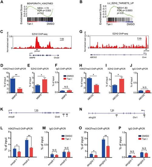 GSEA of the expression profile of NB4 cells treated with DMSO or Tan I using a histone H3K27me3-associated signature “BENPORATH_H3K27ME3” (A) and an EZH2 target genes-associated signature “LU_EZH2_TARGETS_UP (M2139)” (B). (C) Genome browser track representing the binding sites of EZH2 at MMP9 gene locus in human LNCaP cells. (D-F) ChIP-qPCR assay of H3K27me3 (D), EZH2 (E) or IgG (F) occupancy at MMP9 gene locus in NB4 cells treated with DMSO or 10 µM Tan I for 3 days. (G) Genome browser track representing the binding sites of EZH2 at ABCG2 gene locus in human LNCaP cells. (H-J) ChIP-qPCR assay of H3K27me3 (H), EZH2 (I) or IgG (J) occupancy at the ABCG2 gene locus in NB4 cells treated with DMSO or 10 µM Tan I for 3 days. (K) Horizontal lines with Arabic numeral 1 to 2 indicate the regions at the mmp9 gene locus amplified by qPCR in zebrafish ChIP assay. (L-M) ChIP-qPCR assay for H3K27me3 (L) or IgG (M) occupancy at the mmp9 gene locus in zebrafish embryos treated with DMSO or 60 µM Tan I for 3 days. (N) Horizontal lines with Arabic numeral 1 to 2 indicate the regions at the abcg2d gene locus amplified by qPCR in zebrafish ChIP assay. (O-P) ChIP-qPCR assay for H3K27me3 (O) or IgG (P) occupancy at the abcg2d gene locus in zebrafish embryos treated with DMSO or 60 µM Tan I for 3 days. Data are presented as the mean ± SEM. *p < 0.05, **p < 0.01. All results are from three independent experiments. |