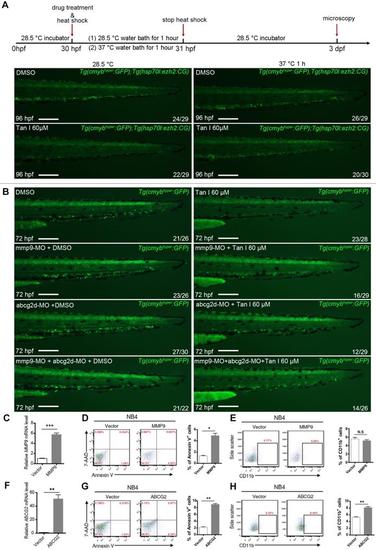 (A) Rescue Tan I induced phenotype by overexpression of ezh2 in the zebrafish embryo. Fluorescent images of c-myb GFP+ cells in Tg(c-mybhyper:GFP) and Tg(hsp70l:ezh2:CG) double transgenic zebrafish embryos, with DMSO or Tan I treatments and with or without a 37 ºC heat shock for 1h, as indicated. dpf (days post-fertilization) (B) Rescue Tan I induced phenotype by knockdown of mmp9 and abcg2 in the zebrafish embryo. Fluorescent images of c-myb GFP+ cells in Tg(c-mybhyper:GFP) transgenic zebrafish embryos. As indicated, mmp9 and abcg2d morpholino was injected separately or together in DMSO or Tan I treated embryos. (C-E) Overexpression MMP9 in NB4 cells. RT-qPCR analyses of MMP9 mRNA level on the established NB4 cells transduced with an empty vector or MMP9-expressing vector (C). Flow cytometric analyses of Annexin V/7-AAD staining (D) and CD11b expression (E) in control or MMP9-overexpressed NB4 cells; (F-H) Overexpression of ABCG2 in NB4 cells. RT-qPCR analyses of ABCG2 mRNA level on the established NB4 cells transduced with empty vector or ABCG2-expressing vector (F). Flow cytometric analyses of Annexin V/7-AAD staining (G) and CD11b expression (H) in control or ABCG2-overexpressed NB4 cells. Scale bars: 200 µm. |