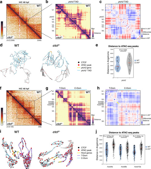 a HiC normalized contact maps at 10-kb resolution from WT and ctcf−/− zebrafish embryos at 48 hpf. A 2-Mb genomic region in chromosome 2 containing the ptch2 locus is plotted. b Virtual HiC matrices of the ptch2 locus from WT and ctcf−/− embryos showing distances based on UMI-4C data at 48 hpf. Viewpoints, including the ptch2 promoter, are shown on the left. The TAD containing ptch2 is highlighted in light blue. c Differential distances at the ptch2 locus from (b), between WT and ctcf−/− embryos. d Representative models of the 3D chromatin structure of the ptch2 locus in WT and ctcf−/− embryos. e Violin plots showing the distances between ATAC-seq peaks and ptch2 promoter within ptch2 TAD. f HiC normalized contact maps at 10-kb resolution from WT and ctcf−/− zebrafish embryos at 48 hpf. A 2-Mb genomic region in chromosome 9 containing the HoxD cluster is plotted. g Virtual HiC matrices of the HoxD locus from WT and ctcf−/− embryos showing distances based on UMI-4C data at 48 hpf. Viewpoints, including the hoxd4a, hoxd9a, and hoxd13a promoters, are shown on the left. The two TADs (T- and C-Dom) at the HoxD locus are highlighted in light blue. h Differential distances at the HoxD locus from g, between WT and ctcf−/− embryos. i Representative models of the 3D chromatin structure of the HoxD locus in WT and ctcf−/− embryos. j Violin plots showing the distances between ATAC-seq peaks in the HoxD locus and hoxd4a, hoxd9a, and hoxd13a promoters. For e and j, statistical significance was assessed using a two-sided Student’s t test. ***P < 0.001. |