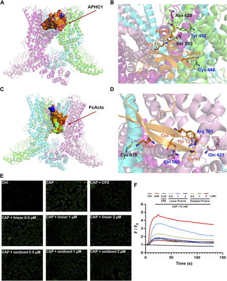 Peptide-protein docking analysis and fluorescent calcium measurement. (A). Side view of protein-peptide docking of the APHC1 peptide binding to the TRPV1 channel. The peptide is shown as a ribbon diagram colored in orange; the protein is shown as a cartoon. (B). Interface residues between APHC1 peptide and the TRPV1 channel. APHC1 peptide is shown in orange cartoon. In α chain, the hydrogen bonds are formed by Arg 18 and Arg 48 of APHC1 peptide with residue Ser 592 and Asn 628, respectively. In β chain, the hydrogen bonds are formed by Lys 28 and Arg 48 of APHC1 peptide with residue Cys 442 and Try 453, respectively. (C). Side view of protein-peptide docking of the PcActx peptide binding to the TRPV1 channel. The peptide is shown as a ribbon diagram colored in orange; the protein is shown as a cartoon. (D). Interface residues between PcActx peptide and the TRPV1 channel. PcActx peptide is shown in orange cartoon. The hydrogen bonds are formed by Tyr12, Gly17, Cys19, and Gln21 of PcActx peptide with residue Gln423, Arg701, Gln560 in γ chain, and Cys578 in δ chain of TRPV1, respectively. (E). Representative images of intracellular calcium concentration of HEK293-hTRPV1 cell (CAP: capsaicin; CPZ: capsazepine). (F). Representative time-dependent response of Ca2+ fluorescence intensity in each group. Ca2+ responses were measured as changes in fluorescence intensity of the representative average plots (n = 5) before (F0) and after capsaicin addition (F). (E,F) graphs represent a single representative experiment from a total of three independent experiments. |