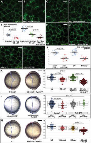(A–D) WT mib1 RNA injection triggers Ryk internalization in 20/21 embryos (B) but has no effect on Vangl2 localization (D, n = 23). (E–G) Mib1 morpholino injection reduces the number of Ryk endosomes that are present upon injection of Ryk-GFP RNA. Increasing the dose of Ryk-GFP RNA restores endosome number in mib1 morphants but not in embryos coinjected with Mib1ΔRF123. (H–J) The number of Ryk endosomes that are present upon injection of Ryk-GFP RNA (12 pg) is reduced in mib1 null mutants. mib1 morphant data from panel E are shown again for comparison. (K) Ryk-GFP RNA (12 pg) rescues axis extension in mib1 morphants but not in embryos coinjected with Mib1ΔRF123. (L) Similarly Ryk-GFP injection rescues axis extension in mib1tf91 mutants. (M) Ryk morpholino injection aggravates mib1 morphant axis extension phenotypes. (A–D,F,G,H,I) dorsal views of 90% epiboly stage embryos, anterior up, scalebars 10 µm. (K,L,M) Lateral views of bud stage embryos, anterior up, scalebars 200 µm. In (E,J) each data point represents the mean number of endosomes for 20 cells from a single embryo. For comparison J again includes the mib1 morphant from panel E. Bars represent mean values ± SEM. In (K,L,M) boxes represent mean values ± SD. See Figure 3—source data 1 for complete statistical information.