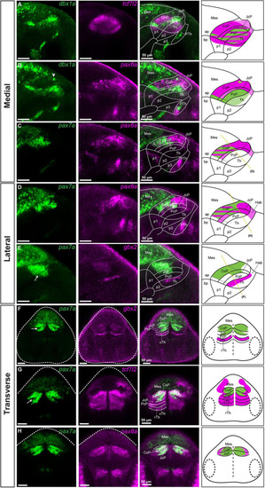 Subdivisions of the pretectum in the brain of 48 hpf zebrafish. Confocal Z-stack images showing brain sections stained using in situ hybridization with dbx1a, pax6a, pax7a, gbx2 and tcf7l2 probes. Sagittal sections: (A)dbx1a expression identifies the PcP in the area of tcf7l2 expression. (B) Co-staining of dbx1a and pax6a shows the alar-basal boundary in prosomere 1 and identifies the pax6a-positive area as the CoP and JcP. (C,D) Co-staining of pax7a and pax6a differentiates between the dorsal, central, and ventral subdomains in the Pt. (E) Staining of pax7a identifies the CoP and JcP and staining of gbx2 identifies cTh in the lateral section. Transverse sections: (F–H)pax7a and gbx2 identify the pretectal domains and the cTh (F), while tcf7l2 stains the Pt and Th (G), and pax6a identifies the CoP and JcP (H). The schemes show the regions identified by the markers in each merged image, with the Pt divided into three rostrocaudal domains: PcP, JcP, and CoP. Stripe pattern indicates co-expression of two markers; saturated color indicates high expression signal while lighter color indicates low signal. The yellow lines (C–E) show the sectioning plane of the transverse sections (F–H). The white arrowhead shows the dbx1a cluster in the dorsal pretectum (B). The white arrow shows the pax7-negative area between the CoP and JcP. ap, alar plate; bp, basal plate; Hab, habenula; Mes, mesencephalon; p1, prosomere 1; p2, prosomere 2; p3, prosomere 3; Pt, pretectum; PcP, precommissural pretectum; JcP, juxtacommissural pretectum; CoP, commissural pretectum; Pth, prethalamus; Th, thalamus; cTh, caudal thalamus; rTh, rostral thalamus; Rh, rhombencephalon.