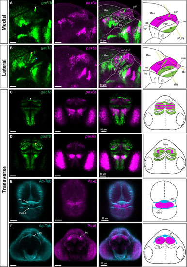 gad1b-positive GABAergic clusters and the identification of Nuc-pc in relation to commissures in the diencephalon of 48 hpf zebrafish. Images showing brain sections stained using immunofluorescence with antibodies specific for acetylated-tubulin and Pax6 (Pax6a and Pax6b), and in situ hybridization with gad1b and pax6a probes. (A,B) In sagittal sections, gad1b and pax6a staining identifies a gad1b-high GABAergic cluster in the dorsal CoP (A, medial section) and two gad1b-high clusters in the central subdomain of the rostral Pt (PcP and JcP) and CoP (B, lateral section). (C) In dorsal sections, co-staining of pax6a and gad1b identifies the gad1b-high cluster as the posterior commissure associated Nuc-pc. (D) In ventral sections, co-staining of pax6a and gad1b identifies a periventricular gad1b-high cluster in the CoP and a lateral gad1b-high cluster in the rostral Pt. (E,F) Acetylated tubulin and Pax6-positive staining identifies the habenular commissure (E) and posterior commissure (F) in transverse sections. White, yellow and blue arrowheads indicate the dorsocaudal, periventricular and lateral gad1b GABAergic clusters, respectively. The schemes depict gad1b-high clusters and the regions identified by the markers in each merged image. Yellow lines show the sectioning plane of the transverse sections. The stripe pattern indicates a co-expression of two markers in a region. ap, alar plate; bp, basal plate; Hab, habenula; Hab-c, habenular commissure; Mes, mesencephalon; Nuc-pc, nucleus of the posterior commissure; pc, posterior commissure; Pt, pretectum; CoP, commissural pretectum; JcP, juxtacommissural pretectum; PcP, precommissural pretectum; p1, prosomere 1; p2, prosomere 2; p3, prosomere 3; Th, thalamus; cTh, caudal thalamus; rTh, rostral thalamus; Pt, pretectum.