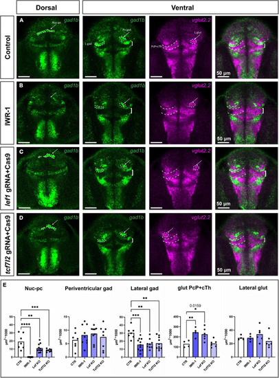 Phenotypes in the pretectum of IWR-1-treated, lef1 crispant and tcf7l2 crispant zebrafish at 48 hpf. Confocal Z-stack images showing brain sections stained using in situ hybridization with gad1b and vglut2.2 probes to visualize different neurochemical clusters of neurons. (A) Control: the gad1b-high Nuc-pc is visible in the dorsal section; gad1b-high lateral and paraventricular clusters in the ventral section; and vglut2.2-positive lateral cluster and vglut2.2-positive region of PcP and cTh are visible in the ventral section. (B) IWR-1: the Nuc-pc is absent, the lateral gad1b-high cluster is smaller, and the vglut2.2-positive area of PcP and cTh is bigger. (C) lef1 crispants: The lateral gad1b-high cluster is smaller, and the vglut2.2-positive area of PcP and cTh is bigger. (D) tcf7l2 crispants: Nuc-pc is smaller and the lateral gad1b-high cluster is smaller. (E) The graphs show volume quantification of distinct clusters indicated in the previous images. Statistics in (E)n = 4–10; one-way ANOVA followed by Dunnett’s post hoc test; *p < 0.05 (the exact p-value is indicated in the graph), **p < 0.01, ***p < 0.001 and ****p < 0.0001. Nuc-pc, nucleus of the posterior commissure; L gad, lateral gad1b-positive cluster; L glut, lateral vglut2.2-positive cluster; Pv gad, periventricular gad1b-positive cluster; CoP, commissural pretectum; JcP, juxtacommissural pretectum; PcP, precommissural pretectum; cTh, caudal thalamus.