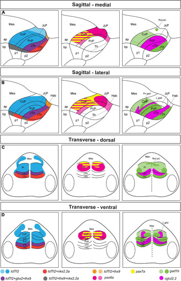 Schematic summary of Figures 1–4. Schemes showing the pattern of marker gene expression and localization of gad1b and vglut2.2-positive areas in the diencephalon of 48 hpf zebrafish. (A,B) Sagittal sections at the medial (A) and lateral (B) levels. (C,D) Transverse section at the dorsal (C) and ventral (D) levels. In the left panel, tcf7l2 expression marks the alar plate of prosomere 1 and 2 and extends into the basal plate; nkx2.2a and lhx9 expression delineate the alar-basal plate boundary in prosomere 1 (CoP, JcP, and PcP) and 2 (Hab, cTh, and rTh); gbx2 and lhx9 expression in the cTh demarcated the rostral border of the Pt; nkx2.2a is also expressed in the rTh, and lhx9 is also expressed in the habenula. In the middle panel, pretectal domains are patterned by the expression of pax6a and pax7a. pax6a is highly expressed in the dorsal subdomain of the Pt. Both pax6a and pax7a markers are present in the central subdomains of the CoP and JcP, but their expression decrease rostrally and ventrally. In the right panel, the expression of gad1b and vglut2.2 identifies several GABAergic and glutamatergic clusters: the Nuc-pc in the caudal edge of the CoP dorsal subdomain, periventricular GABAergic and lateral glutamatergic clusters in the central subdomain of the CoP, lateral GABAergic cluster in the area of the JcP and PcP (lateral parts), and glutamatergic PcP (medial parts). Saturated colors indicate high signal and lighter colors low signal of expression. ap, alar plate; bp, basal plate; Hab, habenula; Mes, mesencephalon; Pt, pretectum; p1, prosomere 1; p2, prosomere 2; p3, prosomere 3; Th, thalamus; cTh, caudal thalamus; rTh, rostral thalamus.