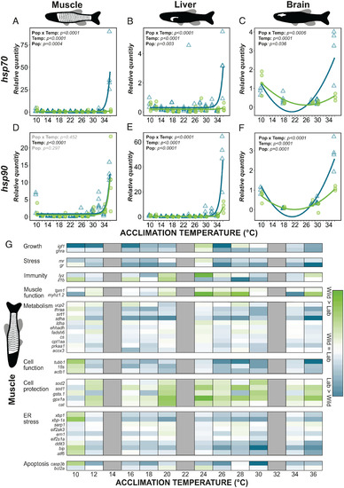 Comparison of gene expression in wild and laboratory zebrafish acclimated to temperatures from 10 °C to 36 °C. Heat shock protein (hsp) expression (A–F): hsp70 and hsp90 in the muscle (A and D), liver (B and E), and brain (C and F). Statistical model results indicated on each panel: Temp, effect of temperature on expression; Pop, difference between wild (light green circles) and laboratory (blue triangles) fish (at 23 °C); Pop × Temp, interaction. (G) Heatmap showing the difference in muscle gene expression (log transformed) between wild and laboratory zebrafish. Genes are grouped by functional groups and colors represent relative expression within these groups where green shows a higher expression in wild fish and blue a higher expression in laboratory fish. White illustrates no difference. Grey illustrates not analyzed. Full gene names and functions can be found in SI Appendix, Table S3.