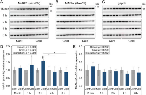 Fig. 3. The result of western blotting A–C. Gel images of MuRF1 (trim63a), MAFbx (fbxo32), and gapdh. D and E. Time-course changes of MuRF1 and MAFbx (n = 6 for both conditions). All data are presented as relative gene expression in comparison to the reference protein gapdh. In the post-hoc test, ∗p < 0.05 indicated significance in the comparisons between different time points, and †p < 0.05 and ††p < 0.01 indicated significance in the comparisons between the cold and control [cont] groups at each time point. |
