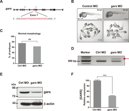 (A) Schematic of the target of the designed splicing-blocking morpholino oligos (MOs) on exon 7, targeting the zebrafish gars gene (red letters). Blue arrows indicate the targets of the primers used for RT-PCR showin in (D). (B) Images showing morphologies of control MOs- or gars MOs-injected larvae at 36 hpf. A, anterior; P, posterior. Scale bars = 500 μm (individual images); 2,000 μm (group images). (C) Quantification of zebrafish embryos showing morphological phenotypes, counted in each genotype at 5 dpf. Statistical significance was determined using unpaired Student’s t-test. ns, non-significant. (D) RT-PCR results confirming gars splicing on exon 7. A red arrow indicates an alternative splicing form induced by gars MOs. (E and F) Comparison of zebrafish gars expression between control and gars KD zebrafish. Results of immunoblot assays for gars and β-actin (E). Protein levels were normalized against β-actin in the same blots, and the quantification of gars expression is presented graphically in (F). Statistical significance was determined using unpaired Student’s t-test. ***P < 0.001. |