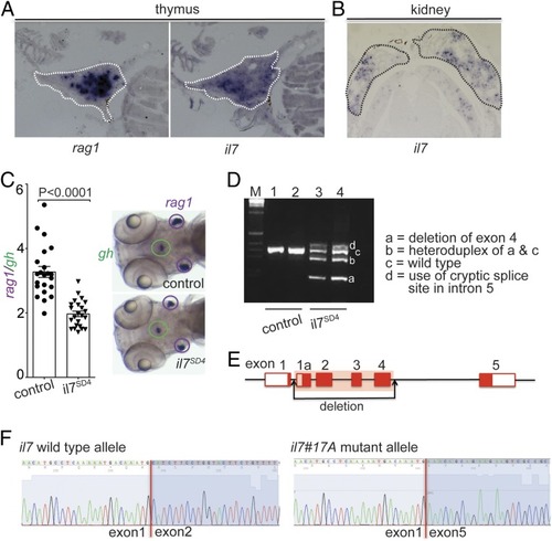 Characterization of the zebrafish il7 gene (ENSEMBL ID: ENSDARG00000092045). (A) RNA in situ hybridization on tissue sections of adult zebrafish thymus with probes specific for rag1 and il7. (B) RNA in situ hybridization on tissue sections of adult zebrafish kidney with a probe specific for il7. (C) Reduced thymopoietic activity in il7 morphants as determined by the thymopoietic index (Left), derived from quantitative analysis of whole-mount RNA in situ hybridization experiments (Right). Each data point represents 1 fish; data are mean ± SEM. (D) RT-PCR analysis of il7 cDNA structures resulting from interference with splicing of the pre-mRNA transcripts by an antisense oligonucleotide targeting the splice donor site of exon 4 (SD4). The deletion in variant a does not cause a frame shift, since all exons of the il7 gene are in phase 0; the use of cryptic splice site in the intron between exons 4 and 5 causes a frame shift mutation. (E) Schematic of the il7 gene structure, indicating the deletion introduced by CRISPR/Cas9 mutagenesis. (F) Sequence analysis of cDNAs demonstrating the loss of sequences derived from exons 2 to 4 in transcripts emanating from the il7#17A mutant allele.