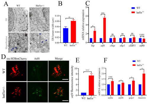 The β cells of hnf1a+/− zebrafish displayed ER stress. (A) Transmission electron microscopy analysis of ER in WT and hnf1a+/− β cells at 6 dpf zebrafish. Blue arrows indicated magnified ER morphology. Scale bar: 3 μm. (B) Quantification of ER lumen width for WT and hnf1a+/− β cells. At least 15 different locations of the same cell were measured; n = 3 β cells for each genotype. (C) RT-qPCR analysis of the mRNA expression levels for ER-stress-related marker genes in WT and hnf1a+/− larvae at 6 dpf: bip, atf4, chop, xbp1, sXBP1, and atf6b. (D) Immunofluorescence analysis of WT and hnf1a+/− larvae at 6 dpf with atf4 staining (Green). β cells are indicated by the red fluorescence with Tg(ins:H2BmCherry). Scale bar indicates 20 μm. (E). Quantification of fluorescence intensity for atf4 in WT and hnf1a+/−; n = 3 larvae for each genotype. (F) RT-qPCR analysis of the mRNA expression levels for nrf2a, nrf2b, gstp1, and hmoxla in WT and hnf1a+/− larvae; n = 3 larvae for each genotype. Results are represented as means with standard errors; * p < 0.05, ** p < 0.01, and *** p < 0.001, and **** p < 0.0001. Student’s t-test. All experiments were performed in at least three biological repeats. WT, wild type.