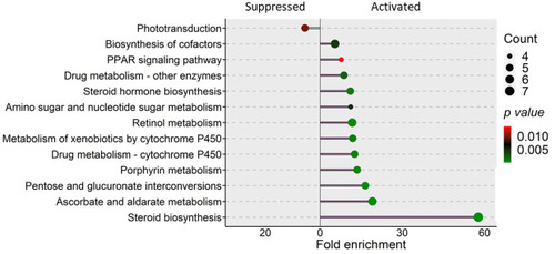 KEGG pathways that were enriched in the zebrafish larvae from the soybean group. Differentially expressed genes in the soybean (SBM) group compared to the control (CT) group were employed for the pathway enrichment analysis. The size of the circles is proportional to the gene count and gradient color bar intensity of circle correlates with the |