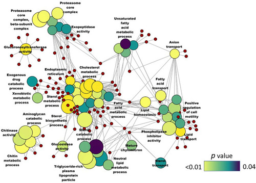 Network plot showing the link between enriched GO terms. DEGs (upregulated; SBM vs CT) that were considered for the enrichment are indicated using red circles and only the non-redundant GO terms are shown in the cluster. The gradient color bar intensity varies with the |