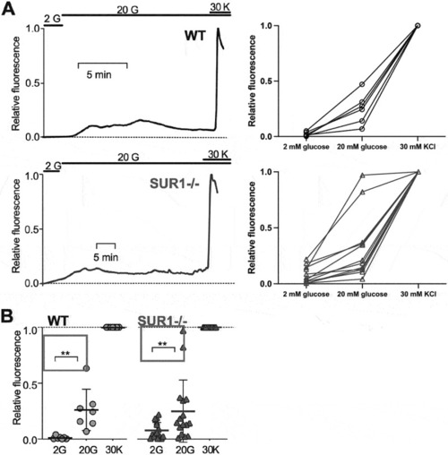 SUR1−/− islets exhibit elevated basal [Ca2+] and reduced responsivity to glucose (a) Representative recordings of intracellular calcium in the presence of 2 mM glucose (2 G) and following switch to 20 mM glucose (20 G) and then 30 mM KCl (30 K), for WT (above, n = 6) and SUR1−/− (below, n = 12). Fluorescence is normalized to maximum fluorescence in 30 K (f = 1), and minimum fluorescence (f = 0) anywhere within the record. Values for each islet are also shown. (b) Average calcium in each condition for WT (N = 8) and SUR1−/− (n = 14). Data in B are analyzed by 1-way ANOVA followed by multiple unpaired t-tests. (*) p < .05, (**) p < .01.