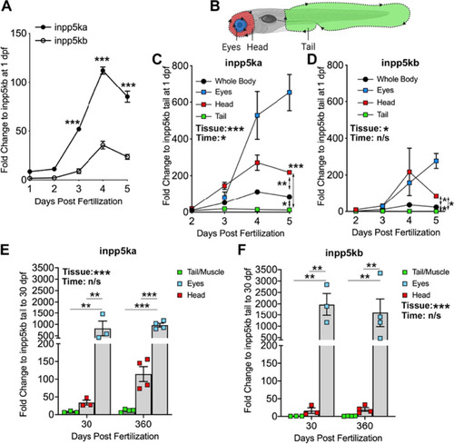 inpp5ka and inpp5kb mRNAs differ in expression levels in zebrafish larvae. A Gene expression determined by qPCR. inpp5ka is more highly expressed in whole body lysates through 5 dpf. B Larval tissues were excised from the eye, head, and tail for localized gene expression analysis excluding the area of the trunk around the yolk. C, D Expression for both inpp5ka (C) and inpp5kb (D) is low in the tail and increases in the eyes and brain. By 5 dpf, both are most highly expressed in the eyes. Results from the whole body from (A) are shown as reference. E, Finpp5ka (E) maintains higher expression levels than inpp5kb (F) in the tail/muscle and head at 30 dpf and in adult fish. Both genes are expressed at very high levels in the eyes. Values are averages ± SEM. 2-way ANOVA results for tissue and developmental timepoint (time) are also listed. *p < 0.05, **p < 0.01, ***p < 0.001