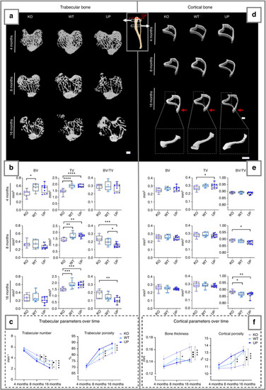 µCT analysis of the metaphysis of the tibia of the male mice at 4, 8 and 16 months. The trabecular bone (left) and the cortical bone (right) were analyzed separately. Regions measured for the trabecular bone and cortical bone are illustrated on the schematic tibia with the growth plate (GP), marked with a red dotted line, used as a reference for their selection. a, d The 3D rendering of each genotype is represented with a scale bar of 500 µm. Red arrows indicate the tibial crest on the 16 months cortical bone. The zoom on the 16 months cortical bone illustrates the lateral side of the tibia with a scale bar of 500 µm. b, e The bone parameters measured for the trabecular and cortical bone were the bone volume (BV); the total volume (TV) and their ratio (BV/TV). The data were plotted as a box plot showing all points. One-way ANOVA was performed with differences being considered significant at P values <0.05 (*P < 0.05, **P ≤ 0.01, ***P ≤ 0.001, ****P ≤ 0.000 1). c, f The trabecular number, trabecular porosity, cortical thickness, and cortical porosity are represented over time. At 4 months: n = 8 for each genotype; at 8 months: n = 8 for the KO, n = 10 for the WT and UP; at 16 months: n = 9 for the KO, n = 11 for the WT, and n = 10 for the UP. Two-way ANOVA was performed on the analysis over time with error bars representing ± SEM and differences being considered significant at P values <0.05, * represents significant differences between the KO and the UP, ♦ represents significant differences between the KO and the WT and Δ represents significant differences between the WT and the UP (*/♦/ΔP < 0.05, **/♦♦/ΔΔP ≤ 0.01, ***/♦♦♦P ≤ 0.001)