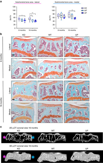 Effect of Omd on the spontaneous development of subchondral bone sclerosis. a Histomorphometry of the subchondral bone on Safranin-O Fast Green of the knee joint of male mice at 8 and 16 months was performed with QuPath on the lateral and medial plateaus of the tibia separately. At 8 months: n = 8 for each genotype; at 16 months: n = 7 for the KO, n = 7 for the WT, and n = 9 for the UP. The data were plotted as a box plot showing all points. Two-way ANOVA was performed with differences being considered significant at P values <0.05 (*P < 0.05, **P ≤ 0.01). b Representative picture of the Safranin-O Fast Green of the knee joint of male mice showing the subchondral bone area for the lateral and medial plateaus of the tibia separately. Scale bar = 100 µm. c µCT of the subchondral bone of the tibia of the mice at 16 months. The pink asterisk indicates the lateral plateau and the blue asterisk indicates the medial plateau