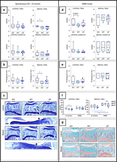 Analysis of the development of OA lesions in the different genotypes after spontaneously occurring with age (left) or after the DMM (right). The spontaneous OA lesions were considered in the 16-month-old male mice and the DMM was performed on 16-week-old male mice and they were stopped at 28 weeks. a, d The cartilage degradation was assessed with the OARSI score (from 0 to 6) according to the OARSI recommendations. The score was attributed to the lateral and the medial tibial plateaus and to the lateral and medial condyles for the spontaneous model and the DMM model. b, e The score of the loss of proteoglycan (from 0 to 5) was assessed according to the OARSI recommendations for the lateral and medial tibial plateaus for the spontaneous model and the DMM model. For the OARSI score of the 16-month-old mice: n = 8 for the KO and the WT and n = 9 for the UP and for the loss of proteoglycan n = 10 for the KO, n = 8 for the WT and n = 10 for the UP. For the DMM model: n = 9 for the KO, n = 10 for the WT, and n = 8 for the UP. One-way ANOVA was performed with differences being considered significant at P values <0.05 (*P < 0.05). c Illustrations of the lateral and medial plateaus stained with Toluidine blue of the 16-month-old mice with zooms on proteoglycan loss issued from the KO and indicated by the arrowhead. Scale bar = 100 µm. f Histomorphometry of the subchondral bone on Safranin-O Fast Green of the knee joint of the DMM mice was performed with QuPath on the medial and lateral plateaus separately. Each genotype was compared to a similar age group of 8-month-old mice. At 8 months: n = 8 for each genotype; for the DMM: n = 9 for the KO, n = 10 for the WT, and n = 8 for the UP. The data were plotted as a box plot showing all points. Two-way ANOVA was performed with differences being considered significant at P values <0.05 (*P < 0.05, **P ≤ 0.01). g Illustrations of the lateral and medial plateaus stained with Safranin-O Fast Green in the DMM. Scale bar = 100 µm