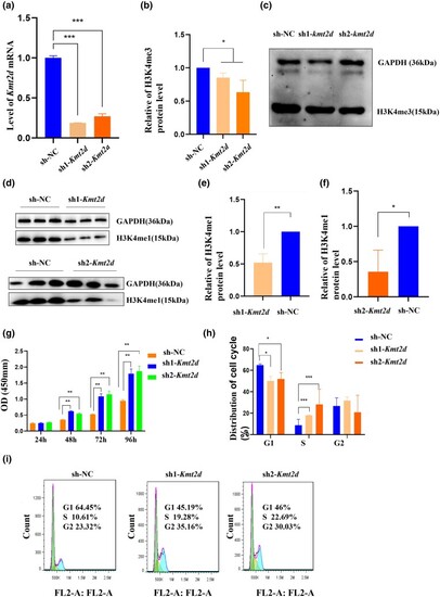 Kmt2d knockdown promoted ATDC5 cell cycle progression and proliferation in vitro. a) The level of Kmt2d mRNA in the ATDC5 cells. b–f) The levels of H3K4me1 and H3K4me3 proteins. The band density was quantified and expressed as the relative gray value (compared with the control) by arbitrarily setting the control value as 1. Data were pooled from 3 independent experiments, and the results were represented as mean ± SD. g) CCK-8 assay was performed to measure the proliferation of ATDC5 cells. The proliferation of the cells was enhanced in the knockdown of Kmt2d groups. h and i) Cell distribution in the G1, S, and G2/M phases of the sh-NC cells compared with those of the sh-Kmt2d cells. *P < 0.05, **P < 0.001, ***P < 0.0001.