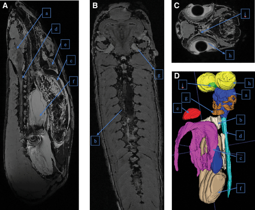 MRIs of 9-month-old WT zebrafish with (1A) sagittal, (1B) axial, (1C) coronal sections, and (1D) 3D reconstruction. Organs analyzed include (a) brain, (b) kidneys, (c) liver, (d) spinal cord, (e) heart, (f) swim bladder, (g) ears/otolith organ, (h) eyes, and (i) optic nerve. 3D, three-dimensional; MRI, magnetic resonance imaging; WT, wild type. |